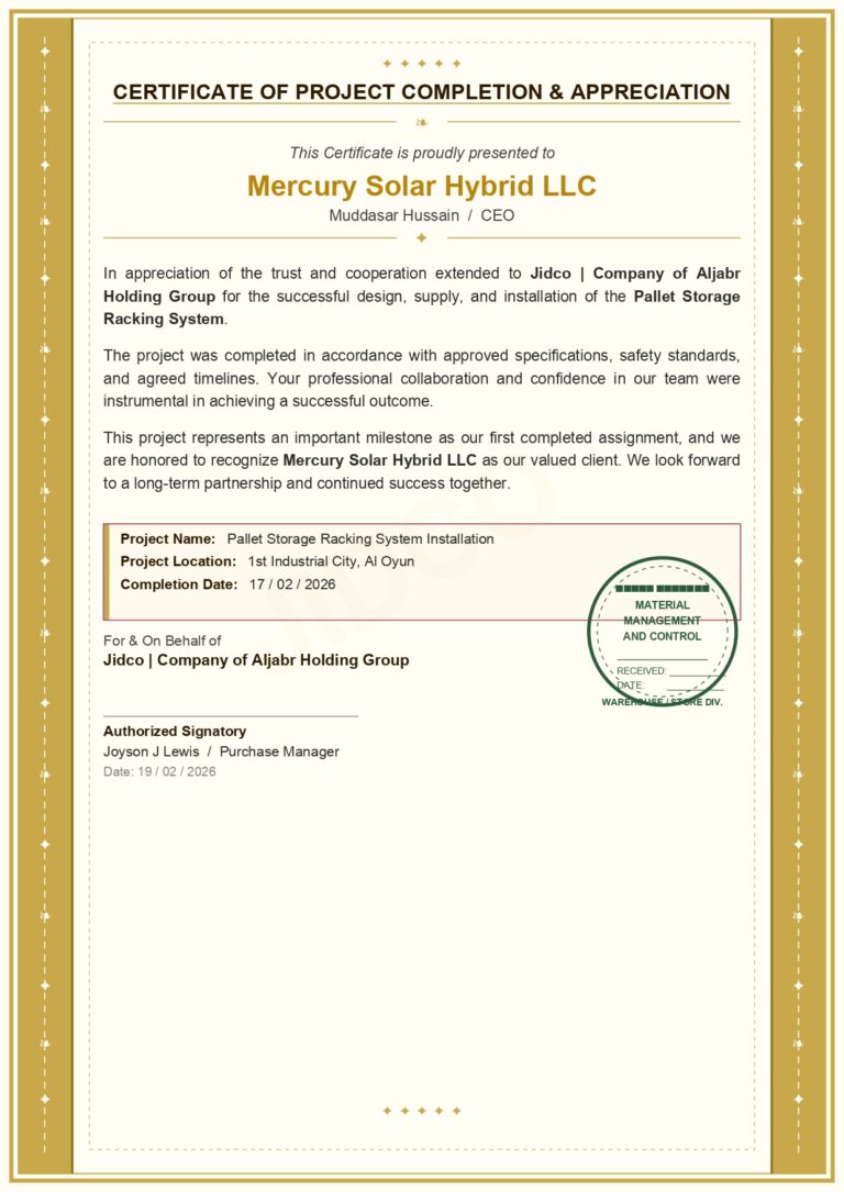 Mercury Solar Hybrid LLC is a multidisciplinary engineering and infrastructure solutions company specializing in solar energy systems, water pumping installations, industrial automation, warehousing & pallet racking solutions, and machinery spare parts supply.